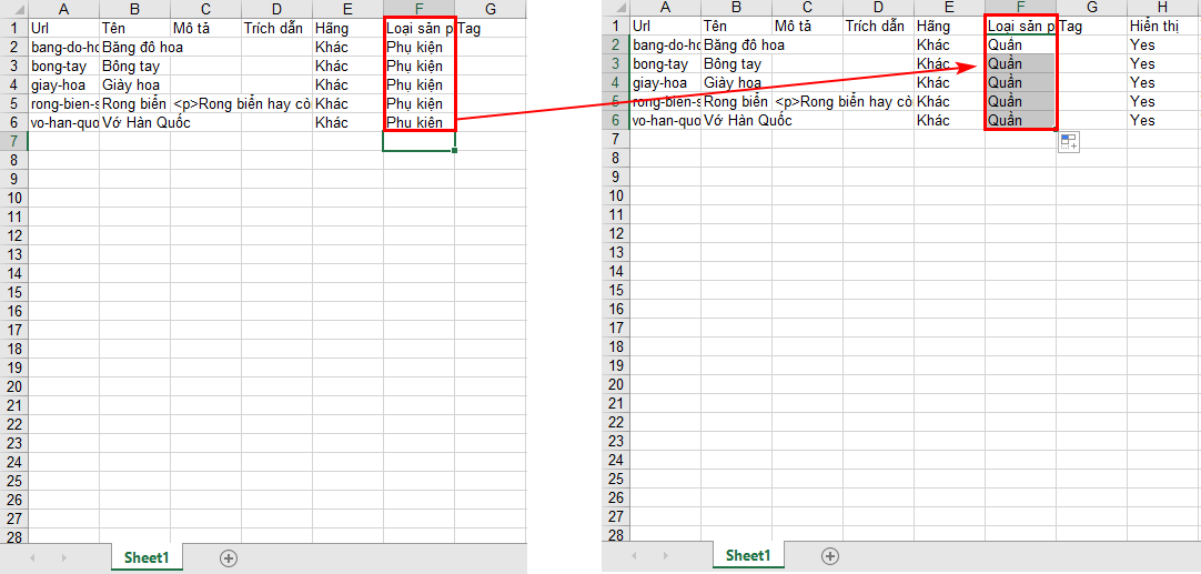 Trong file sản phẩm tải về,ở cột loại sản phẩm, bạn nhập lại loại sản phẩm khác