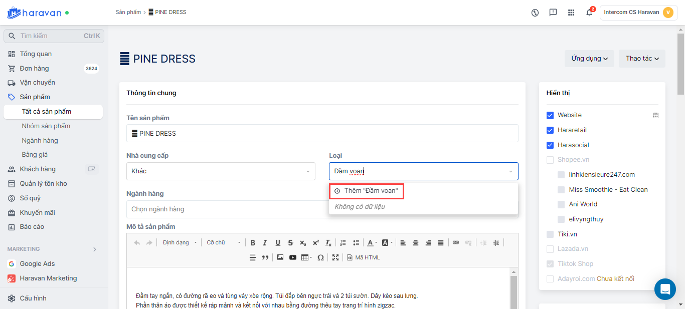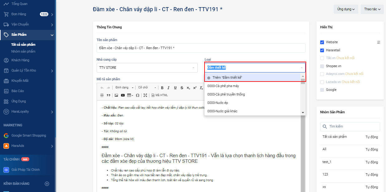 Để thêm mới một loại sản phẩm, bạn nhập tên loại sản phẩm và click chuột ra ngoài khoảng trống và bấm Lưu. Hoặc chọn Thêm loại sản phẩm (Làm tương tự với ô nhà cung cấp)