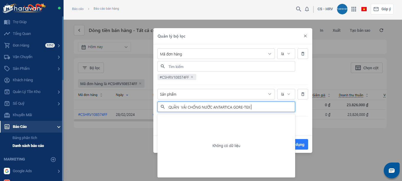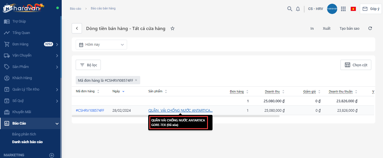 Vấn đề: Bạn xem báo cáo vẫn thấy hiển thị sản phẩm QUẦN VẢI CHỐNG NƯỚC ANTARTICA GORE-TEX