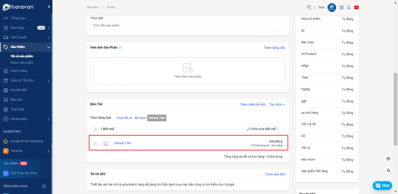 2. Xóa hết các biến thể sản phẩm. Hệ thống yêu cầu sản phẩm có tối thiểu một biến thể. Nếu là không có phiên bản thì sản phẩm có Thuộc tính là Tiêu đề và Phiên bản là Default Tittle.