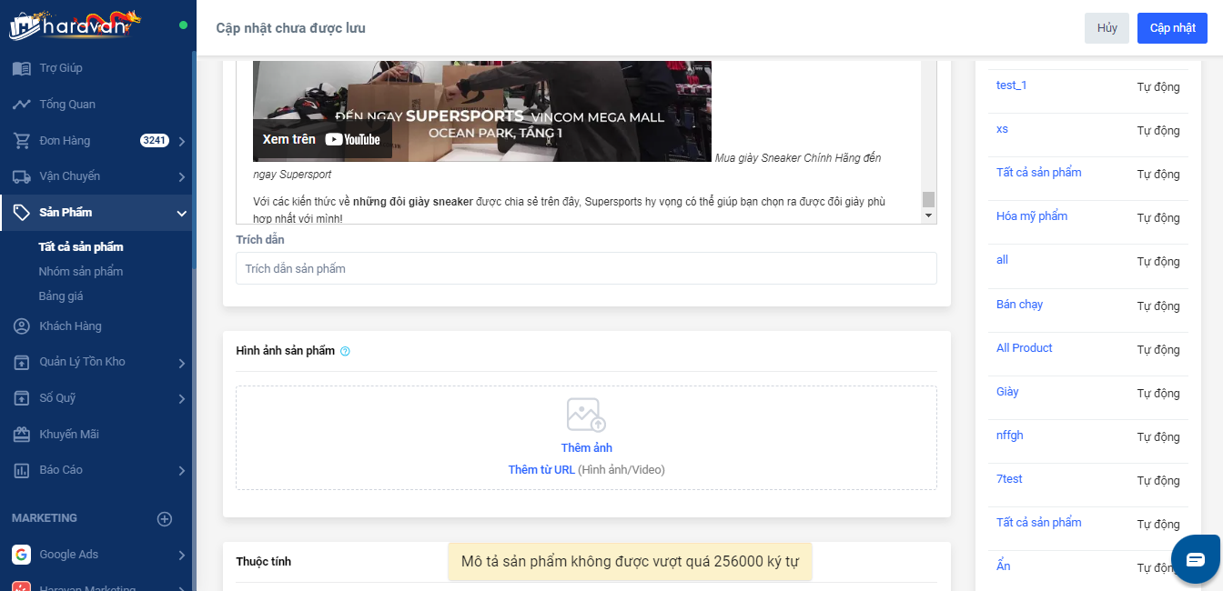 4. Mô tả sản phẩm vượt quá 256000 ký tự: hệ thống sẽ đếm kí tự HTML của mô tả sản phẩm, nếu vượt quá giới hạn 256000 sẽ không thể tạo sản phẩm thành công.