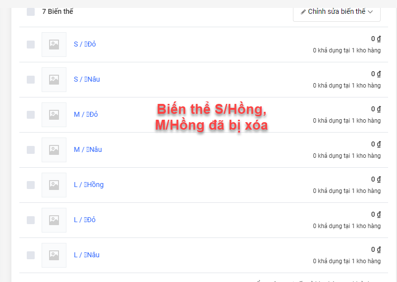 Ví dụ sản phẩm có thuộc tính kích thước S,M,L và màu Đỏ, Nâu, Hồng nhưng theo hình bên dưới thì sẽ không thấy biến thể S/Hồng và M/Hồng vì biến thể này đã bị xóa. Do đó giá trị thuộc tính này sẽ được giữ cố định vị trí, không thể cập nhật lại được