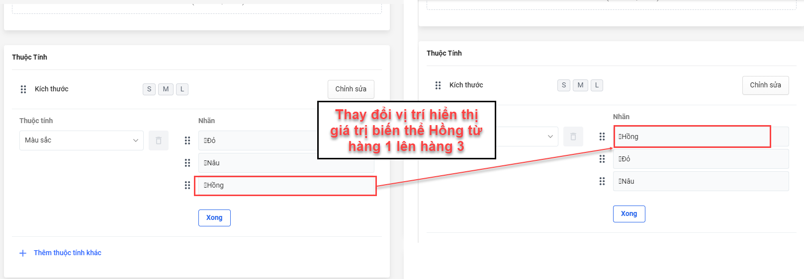 Shop chọn "Sắp xếp giá trị thuộc tính"vàchỉnh sửa vị trí các biến thể. Sau đó bấm Hoàn tấtnhưng vị trí không thay đổi