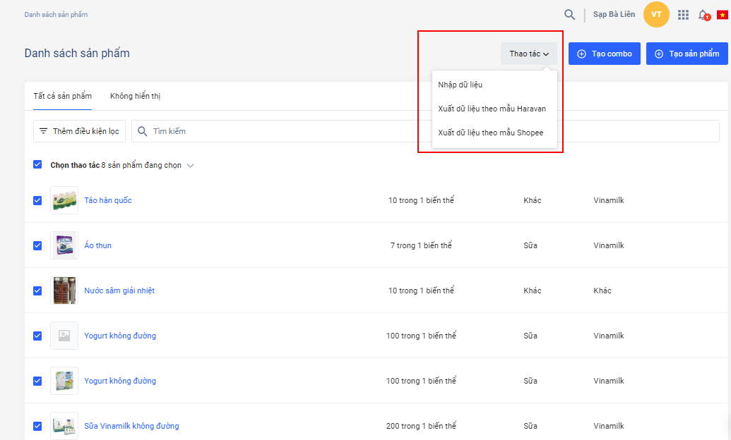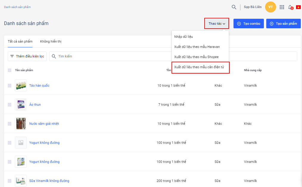 Sau khi bật cấu hình xong, Nhà bán hàng sẽ thấy được lựa chọn Xuất dữ liệu theo mẫu cân điện tử