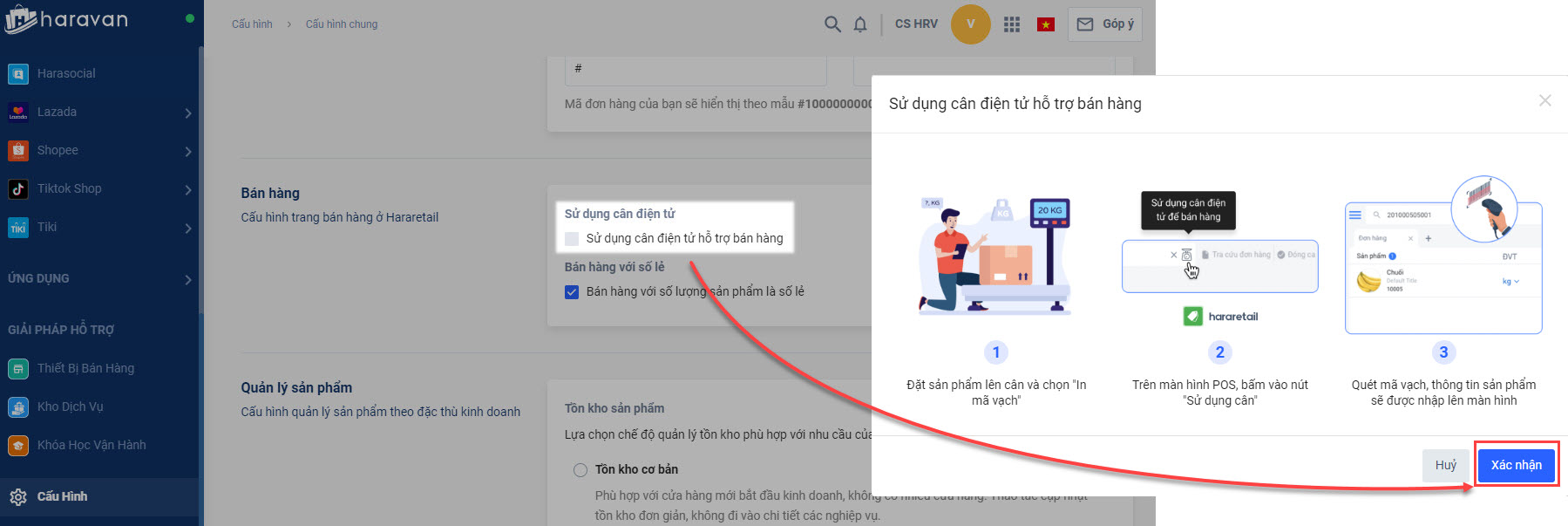 2. Tại mục bán hàng, chọn Sử dụng cân điện tử hỗ trợ bán hàng -> Xác nhậnđể hoàn tất