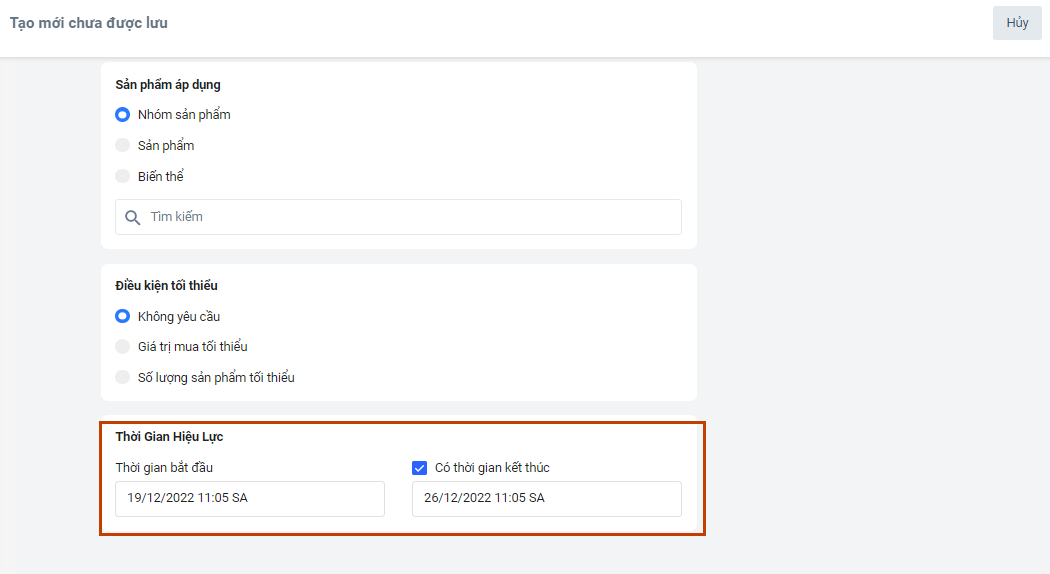 Lúc tạo khuyến mãi có phần Thời gian hiệu lực bạn vui lòng chỉnh sửa ở đó.