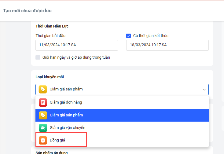 Câu hỏi thường gặpQuản lý khuyến mãiMuốn tạo khuyến mãi đồng giá được không ?Muốn tạo khuyến mãi đồng giá được không ? Được. Lúc tạo khuyến mãi chổ Loại khuyến mãi Haravan có hỗ trợ Đồng giá. NHỮNG BÀI VIẾT LIÊN QUAN Tạo mã khuyến mãi và chương trình khuyến mãi Ứng dụng - Mua X Tặng Y Ứng dụng - Haravan Combo Ứng dụng Bulk Discount Plus