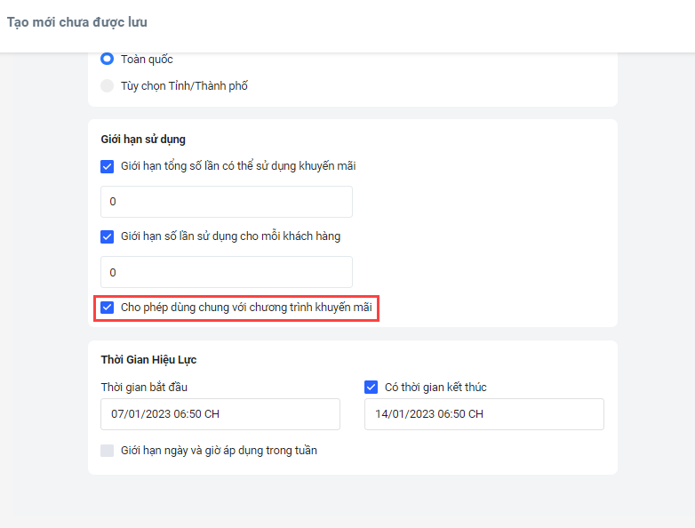 Lúc tạo mã khuyến mãi (coupon) bạn không check vào “Cho phép sử dụng chung với chương trình khuyến mãi” trong mục Giới hạn sử dụng.
