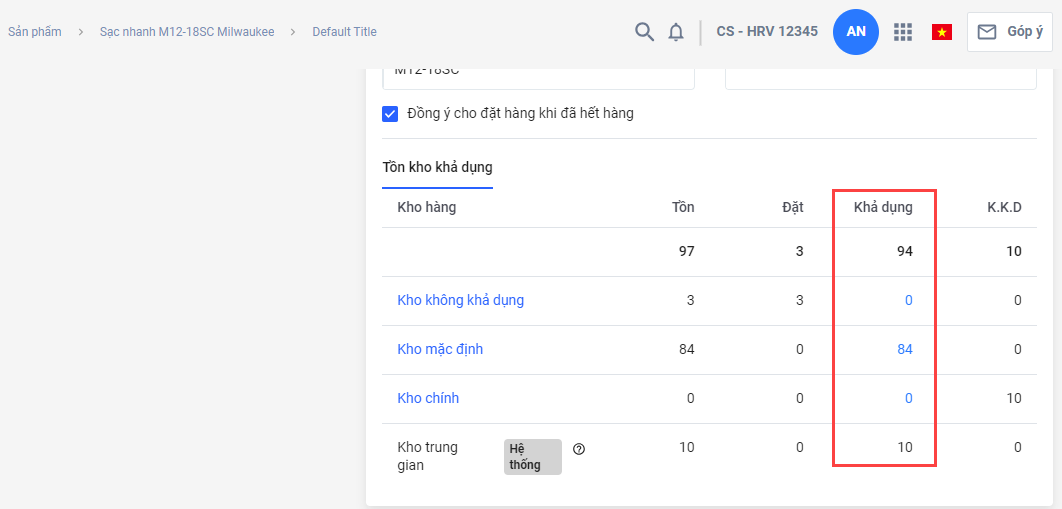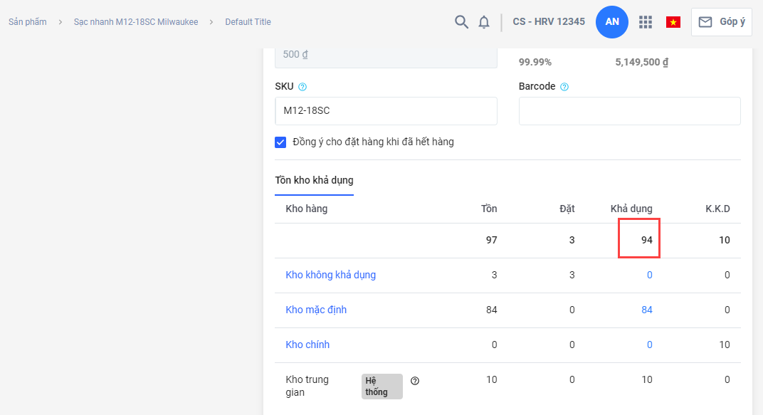 Nhưng trong trang chi tiết sản phẩm, số khả dụng của sản phẩm là 94
