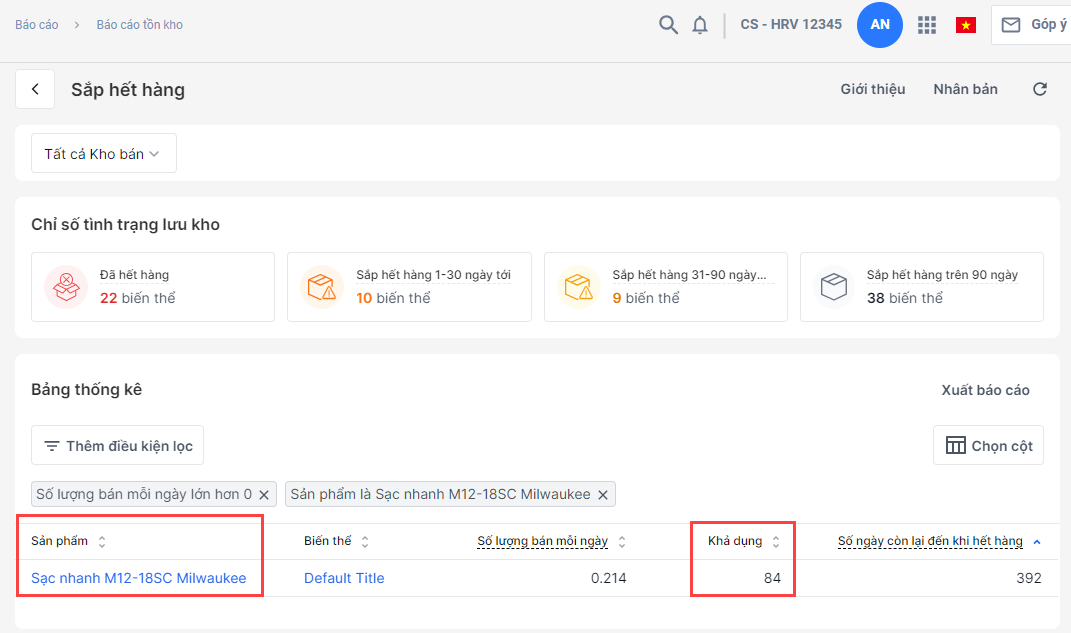 Ví dụ trong báo cáo sắp hết hàng, sản phẩm Sạc nhanh M12-18SC Milwaukee có số khả dụng là 84