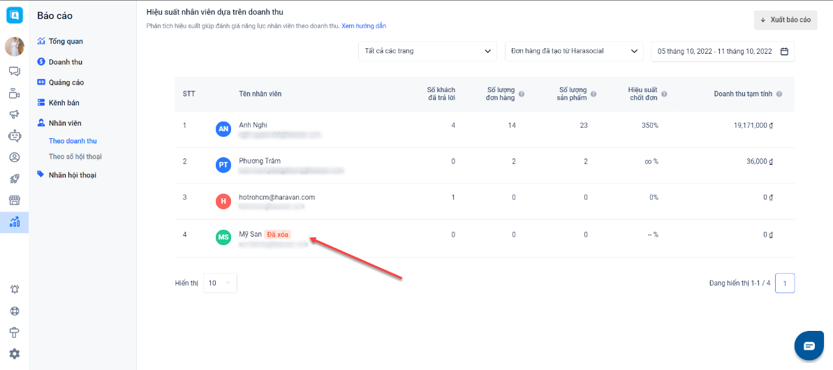 Khi bạn chọn xem báo cáo nhân viên theo doanh thu hoặc hội thoại, các nhân viên đã nghỉ định vẫn sẽ được hiển thị và được thêm ghi chú (Đã xóa). Các chỉ số báo cáo của nhân viên đã nghỉ việc vẫn sẽ được lưu trữ dựa theo mốc thời gian mà bạn lọc.