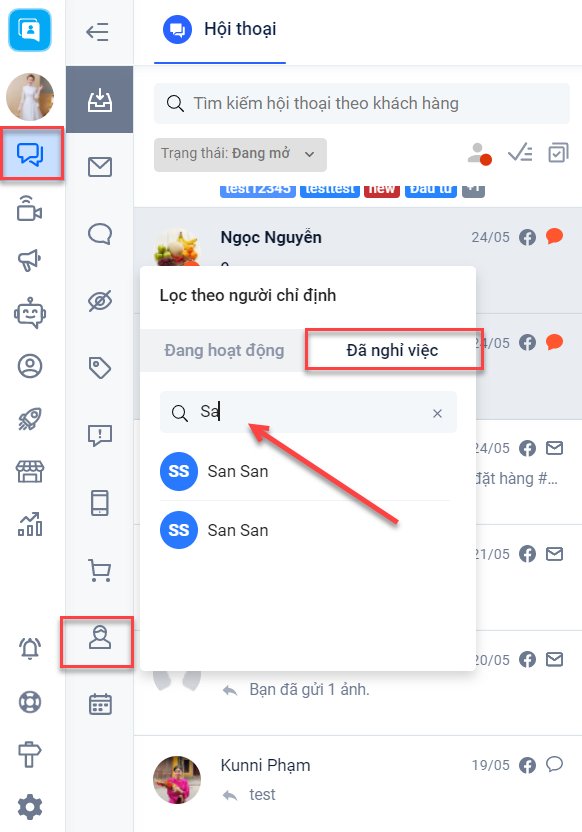 Bạn có thể tìm những hội thoại của nhân viên đó bằng cách: truy cập Hội thoại → Chọn bộ lọc “Lọc theo người chỉ định” → Chọn “Đã Nghỉ việc” và nhập tên nhân viên đã nghỉ việc vào → Khi đó những hội thoại trước đây đã chỉ định cho nhân viên này sẽ được hiển thị.
