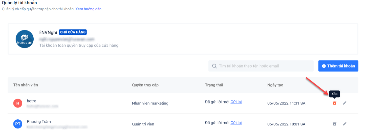 Khi thực hiện thao tác Xóa tài khoản nhân viên ra khỏi Harasocial, đồng nghĩa với việc nhân viên ấy đã nghỉ việc.