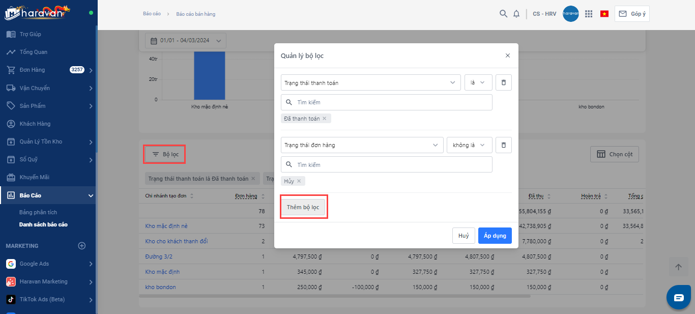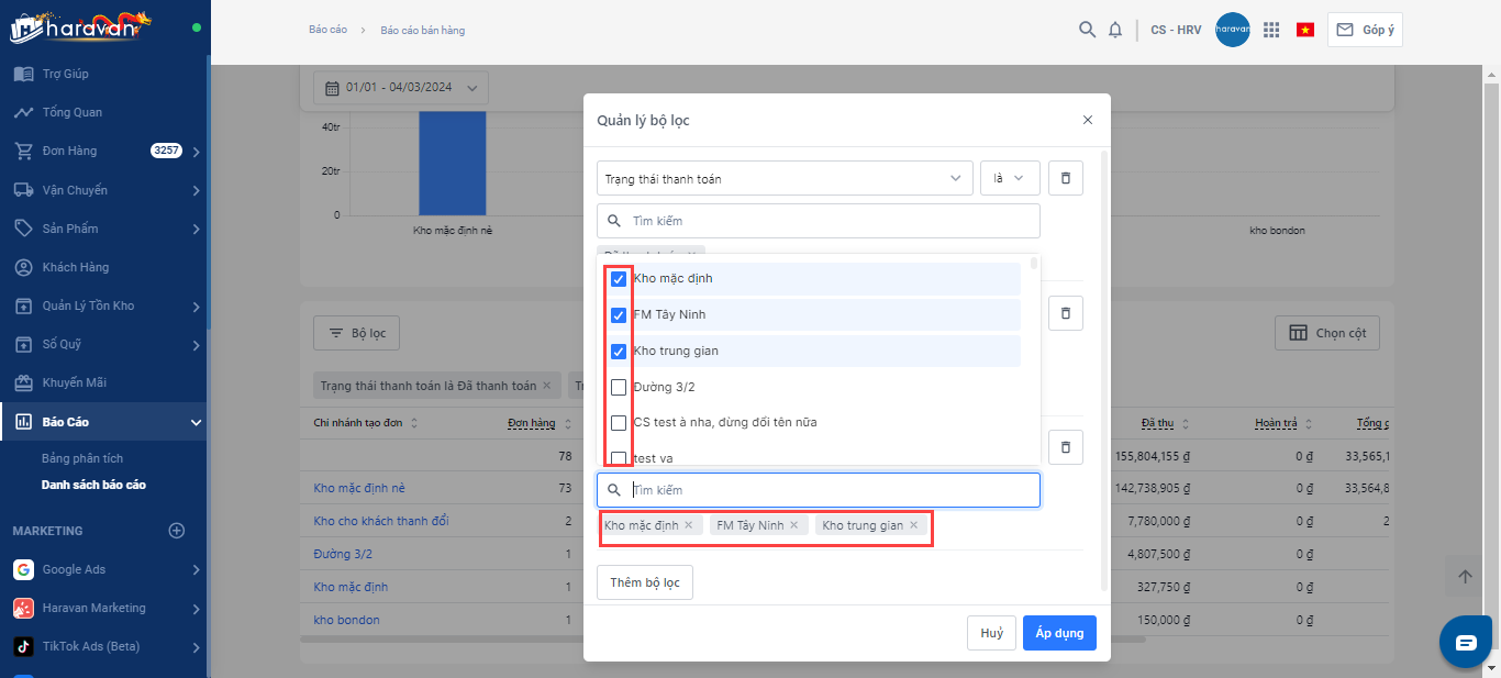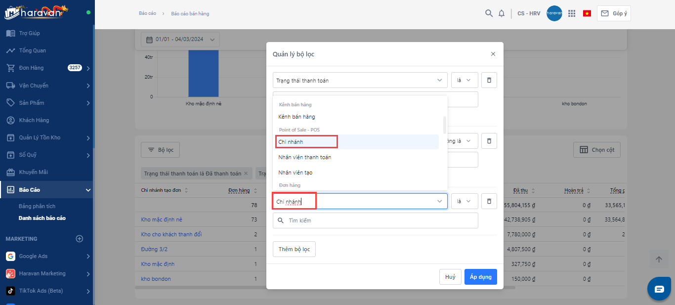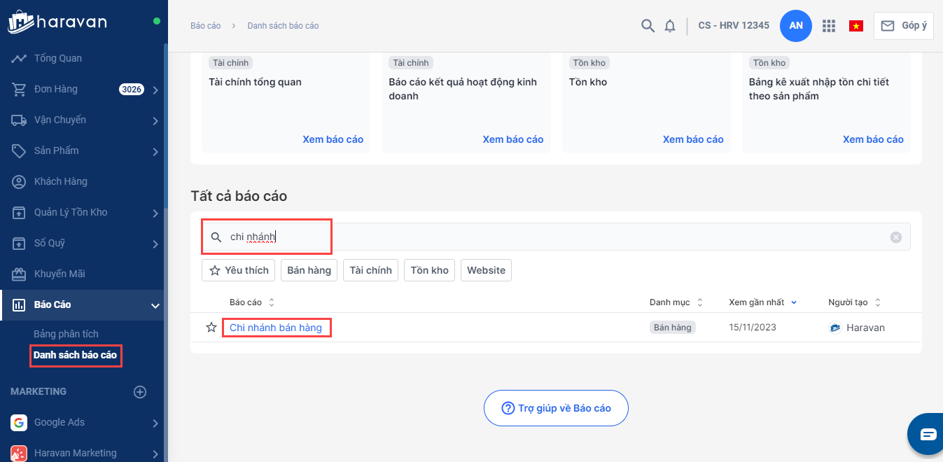 Hệ thống Haravan có hỗ trợ báo cáo theo từng chi nhánh không ?