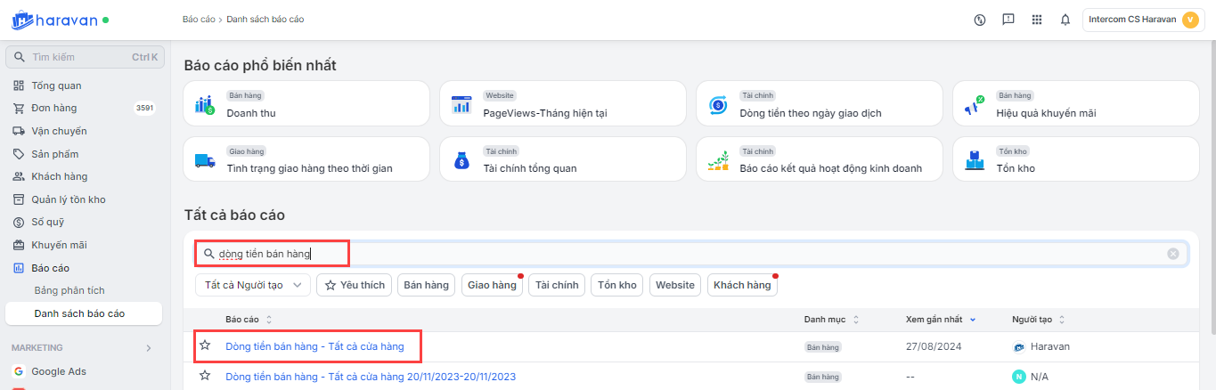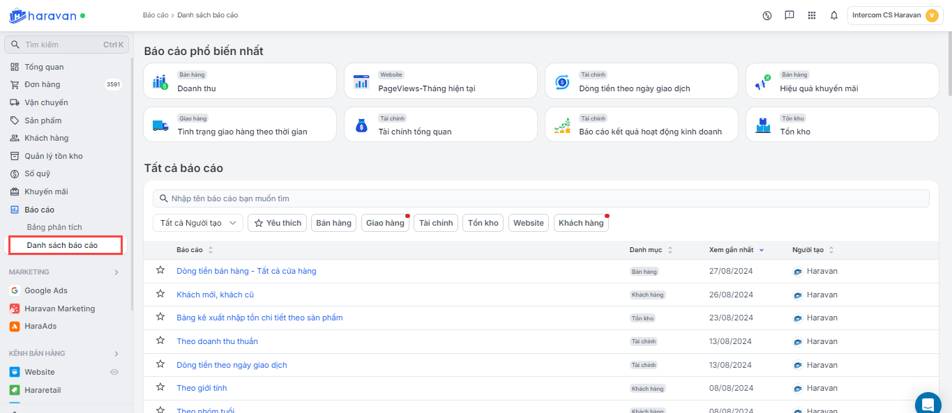 - Truy cập vào phần "Báo cáo" trong hệ thống Haravan và chọn Danh sách báo cáo
