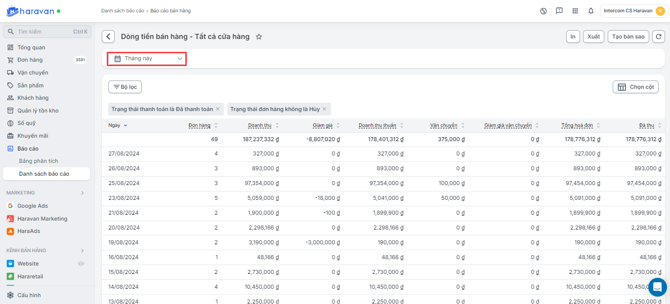 - Trong phần lọc thời gian, chọn "Tháng này". Báo cáo sẽ hiển thị doanh thu từ đầu tháng đến thời điểm hiện tại, giúp bạn đánh giá hiệu suất bán hàng của shop trong tháng này.