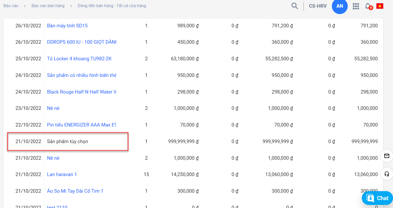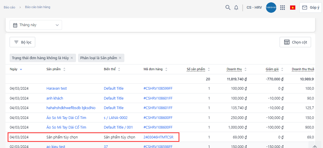 Ví dụ: Ngày 04/03/2024, báo cáo ghi nhận sản phẩm tùy chọn cho đơn hàng 230404...CSR