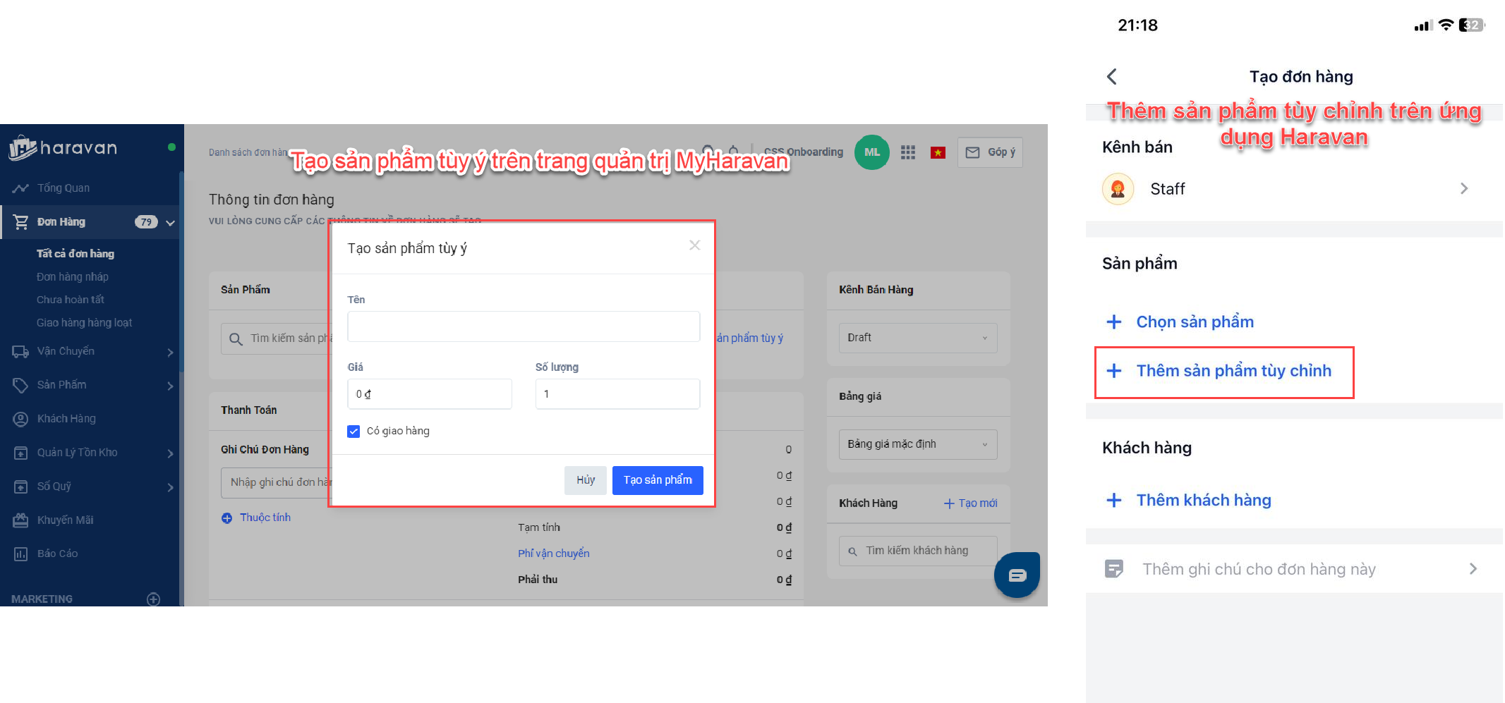 - Được thêm tùy ý khi tạo đơn hàng trên trang quản trị My Haravan hoặc trên ứng dụng Haravan