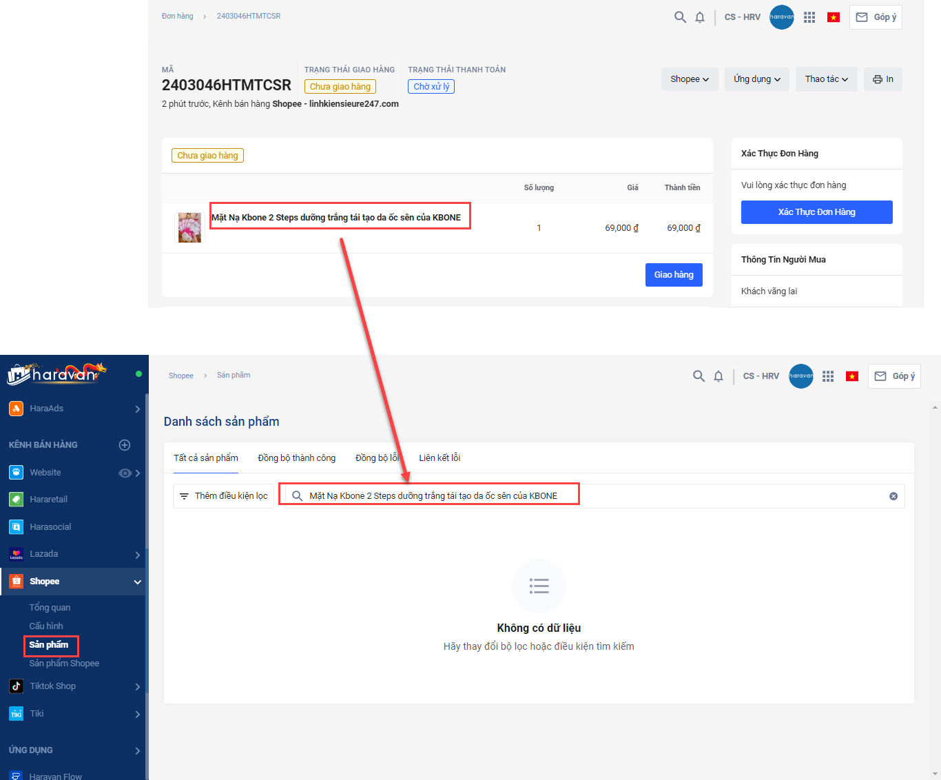 Sản phẩm này nằm trên đơn phát sinh từ sàn và sản phẩm chưa được liên kết với sản phẩm ở Haravan. Để kiểm tra sản phẩm đã liên kết chưa, bạntìm kiếm tên sản phẩm hoặc barcode sản phẩm trong mục Sản phẩm (của sàn tương ứng)