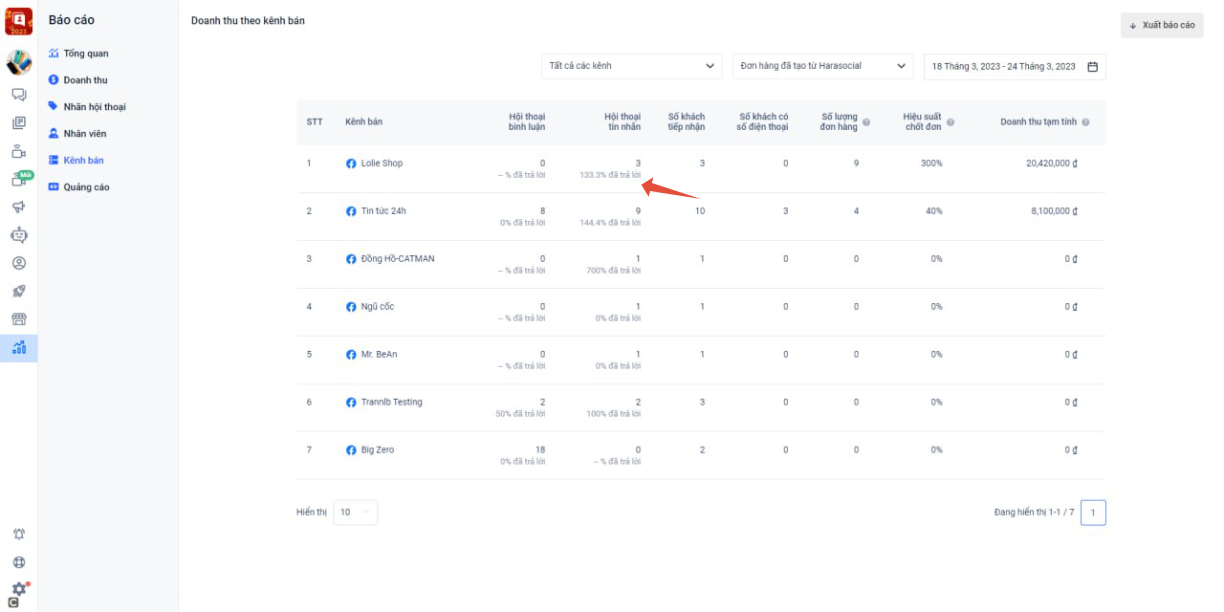Hiện tại Harasocial đang thống kê các số liệu báo cáo từ 00:00 đến 23:59 hàng ngày. Trong trường hợp nhân viên phản hồi lại các hội thoại của các ngày trước đó, điều này sẽ dẫn đến tình trạng tỷ lệ phản hồi hay những chỉ số liên quan giữa số hội thoại trong ngày và số hội thoại có tương tác sẽ chênh lệch nhau.