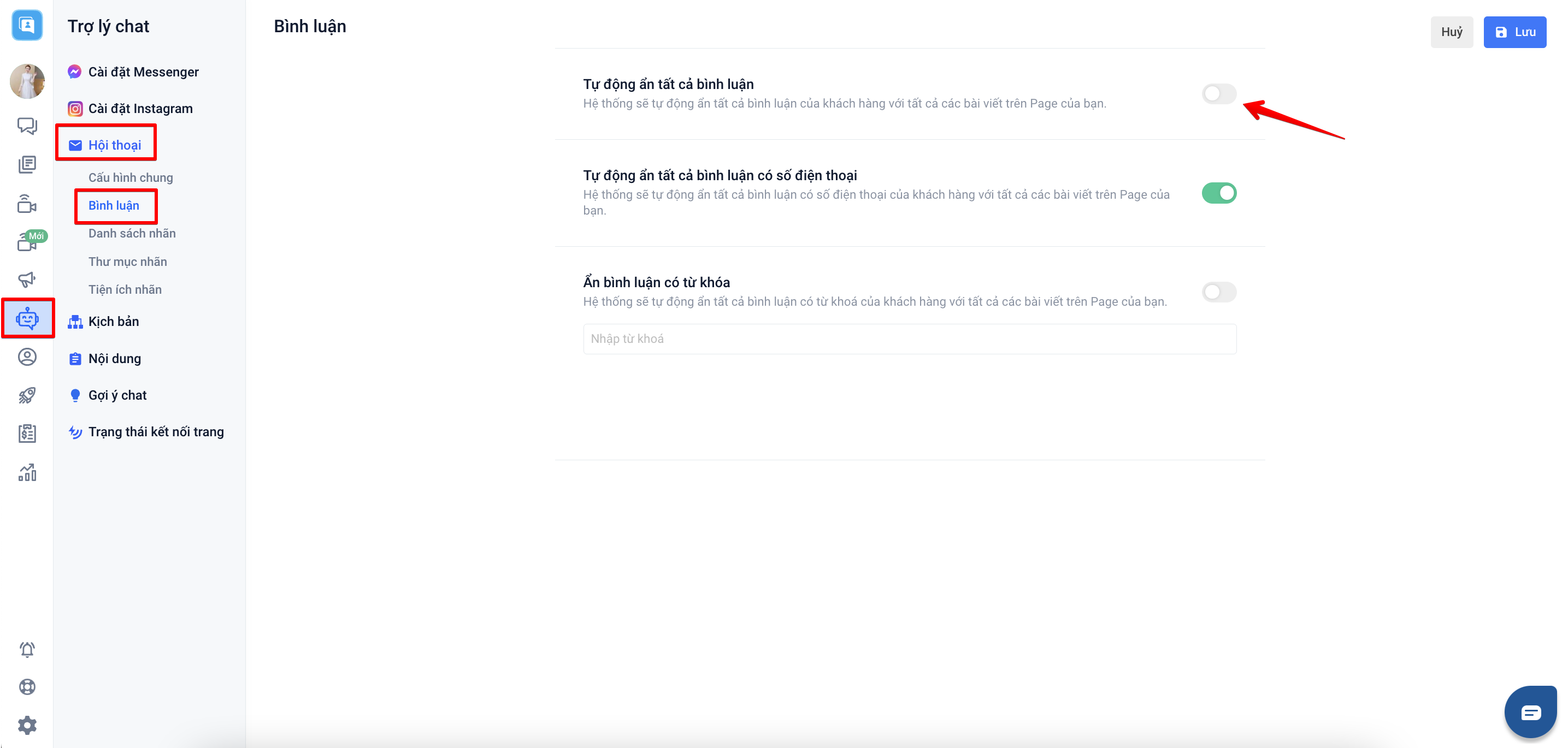 Với lựa chọn này hệ thống sẽ giúp bạn tự động ẩn tất cả bình luận có chứa từ khóa mà bạn thiết lập.