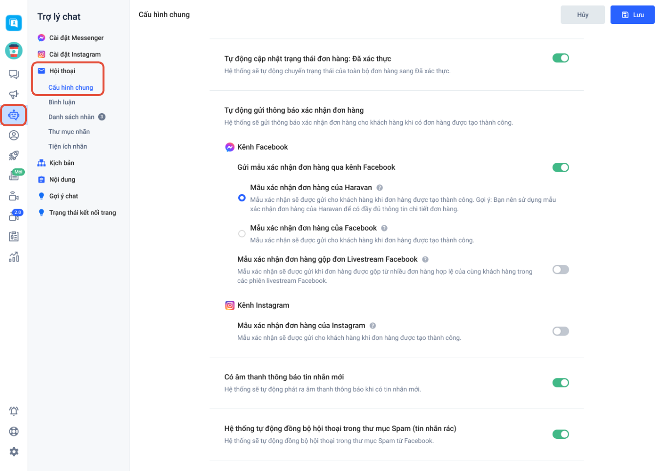 Với cấu hình Hội thoại, bạn có thể thiết lập những thao tác tự động thực hiện với hội thoại của bạn, tối ưu được thời gian xử lý hội thoại và chăm sóc khách hàng của nhân viên.
