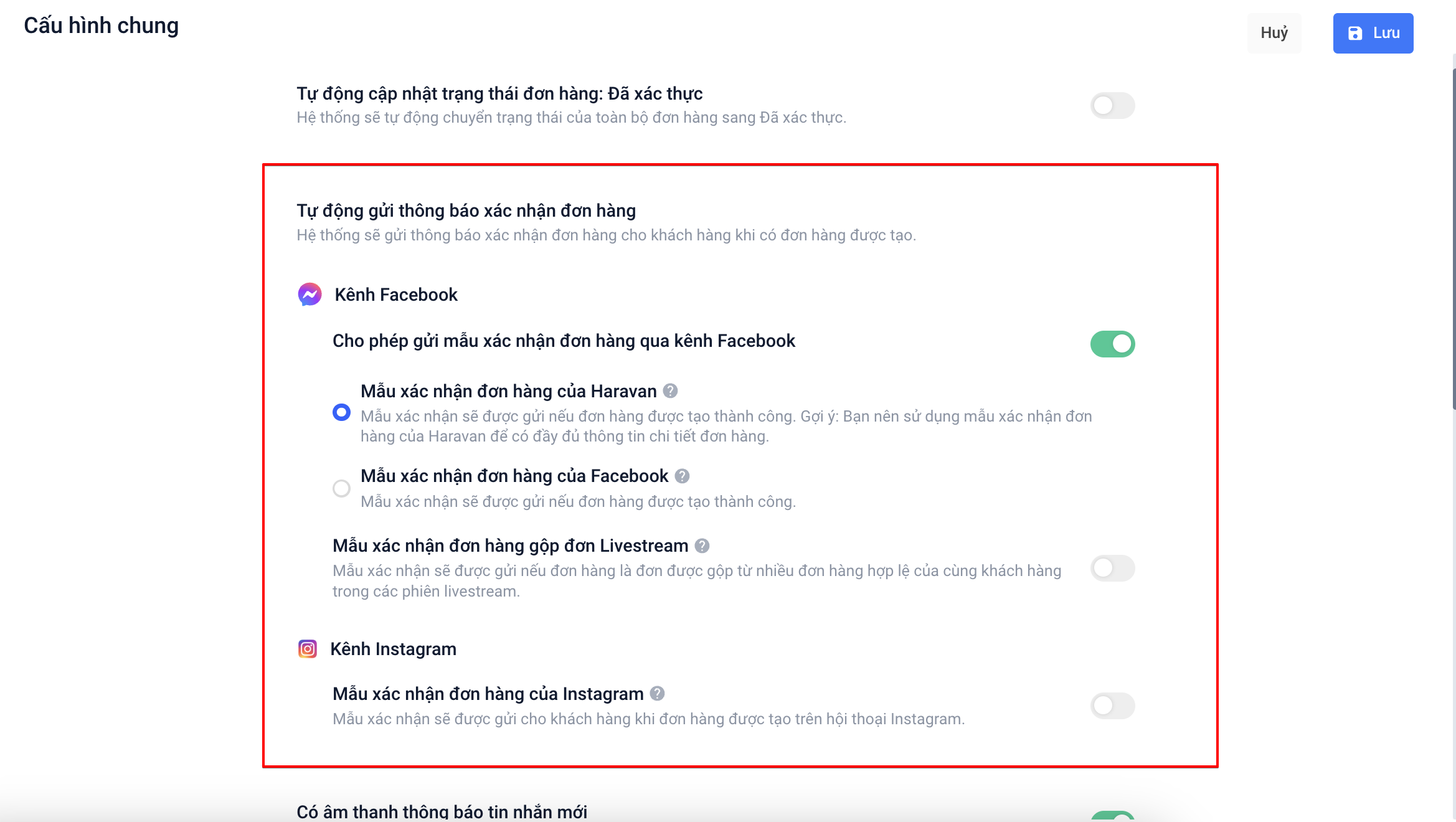 -Mẫu xác nhận đơn hàng của Haravan và Facebook đều sẽ gửi nếu đơn hàng được tạo thành công. Bạn chỉ có thể lựa chọn 1 trong 2 mẫu xác nhận đơn hàng để sử dụng.