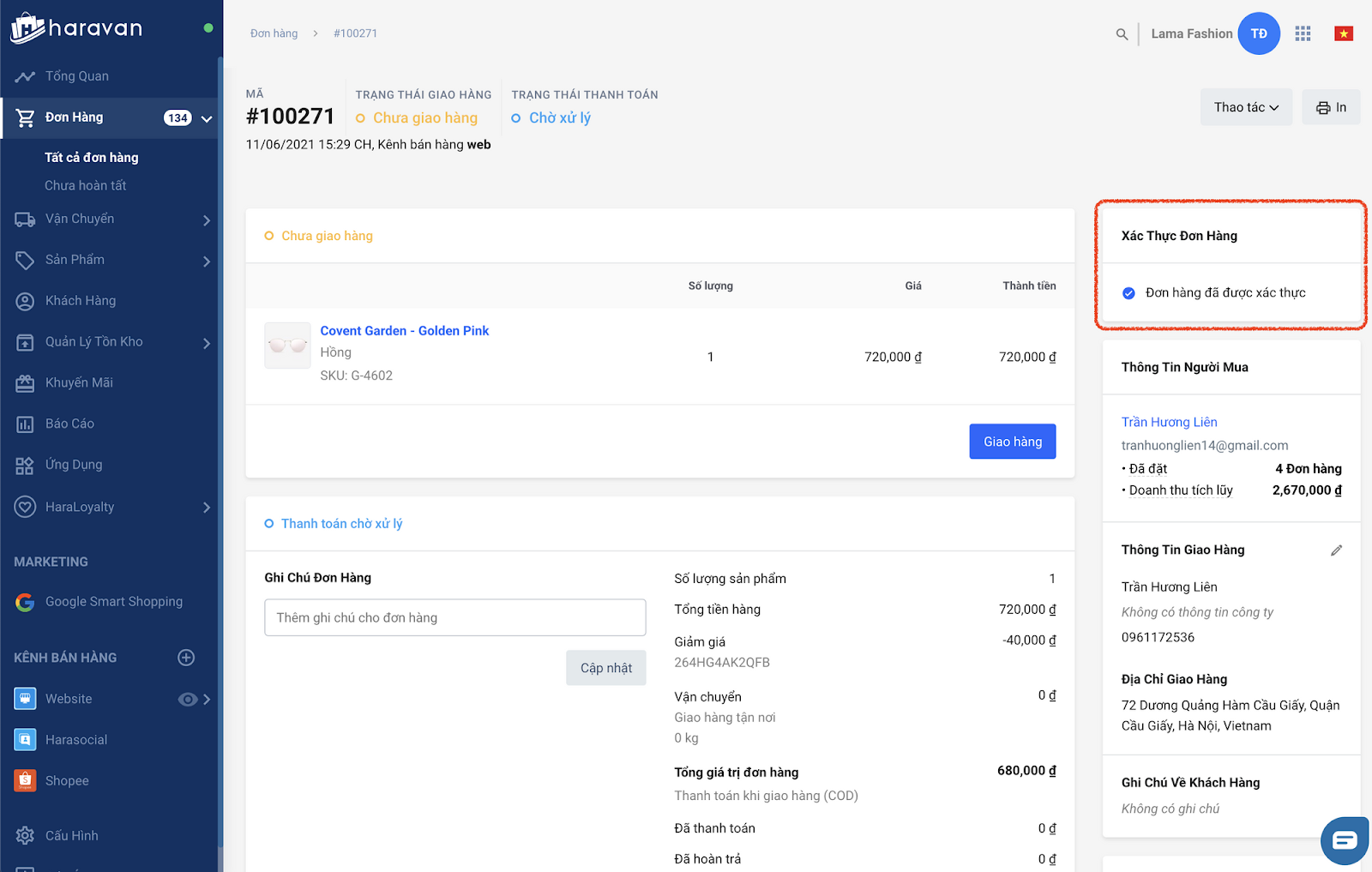 Nếu bật tính năng này thì khi bạn tạo đơn hàng trong Harasocial → sau đó thao tác xử lý đơn hàng ở trang quản trị MyHaravan → trạng thái đơn hàng trên trang quản trị MyHaravan sẽ tự động được cập nhật là Đã xác thực: