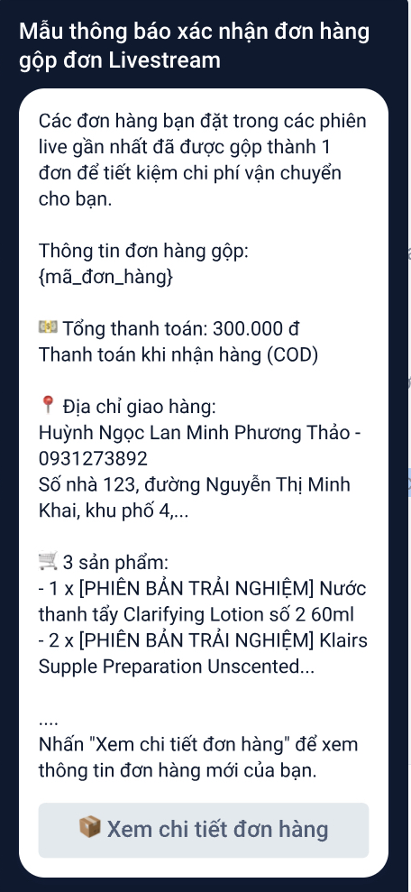 - Mẫu xác nhận đơn hàng gộp Livestream: Mẫu xác nhận sẽ được gửi nếu đơn hàng là đơn được gộp từ nhiều đơn hàng hợp lệ của cùng khách hàng trong các phiên livestream.