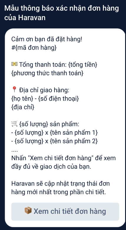 Gợi ý: Bạn nên sử dụng mẫu xác nhận đơn hàng của Haravan để có đầy đủ thông tin đơn hàng.