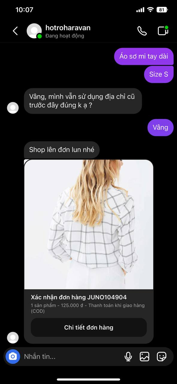 Tại hội thoại, mẫu xác nhận đơn hàng của Instagram sẽ hiển thị như sau: