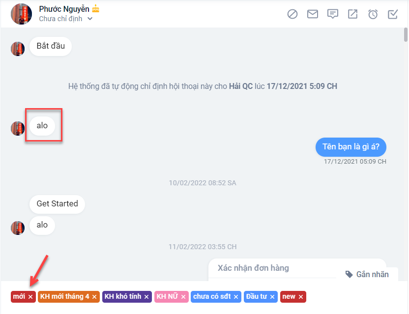 Ví dụ: bạn chọn gắn nhãn “mới” với những hội thoại có chừa từ khóa là “chào”, “alo” hoặc “hi”. Thực tế hiển thị trên những hội thoại sẽ được gắn nhãn như sau: