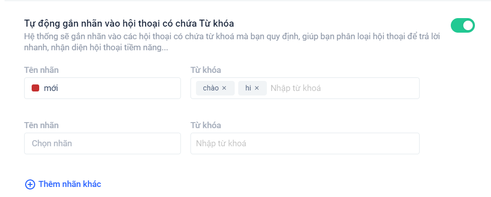 - Bạn có thể tạo tối đa 5 nhãn tự động cho các hội thoại có chứa từ khóa.