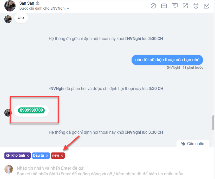 Với các hội thoại có chứa số điện thoại, hệ thống sẽ tự động gắn nhãn cho hội thoại đó. Bạn chỉ cần thiết lập nhãn sau đó lựa chọn nhãn bạn muốn gắn là được. Cách thiết lập nhãn bạn có thể tham khảo tại đây.