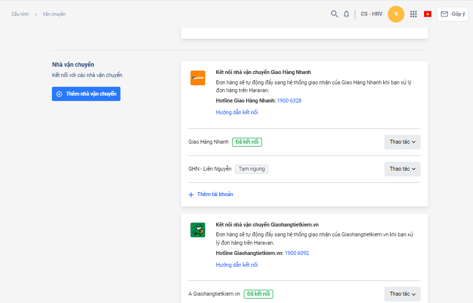 Hệ thống haravan chỉ hỗ trợ kết nối với các nhà vận chuyển được kết nối thông qua mục Cấu hình Vận chuyển trong Trang quản trị Haravan.