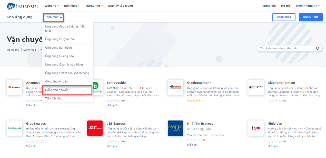 Nếu bạn muốn kết nối với nhà vận chuyển khác, bạn vào website https://apps.haravan.com. Tại mục danh mục, bạn chọn Cổng vận chuyển.
