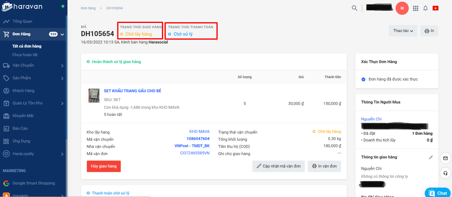 Đơn hàng trênVNPostđã báo giao hàng thành công và nhận COD nhưng trên Haravan vẫn đang ở trạng thái là chờ lấy hàng và chưa thu COD.