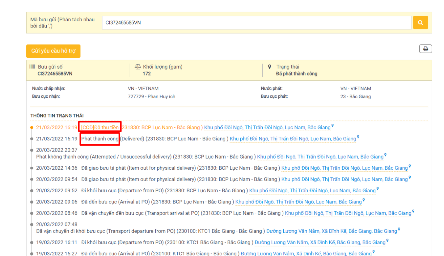 Trường hợp này phía VNPost xác nhận chỉ trả về trạng thái **Chưa nhận COD (110)**cho phía Haravan. Như trên mô tả, đơn này phía VNPost hiển thị đã thu là thu từ người mua, nhưng họ chưa xác nhận trả COD cho phía shop.