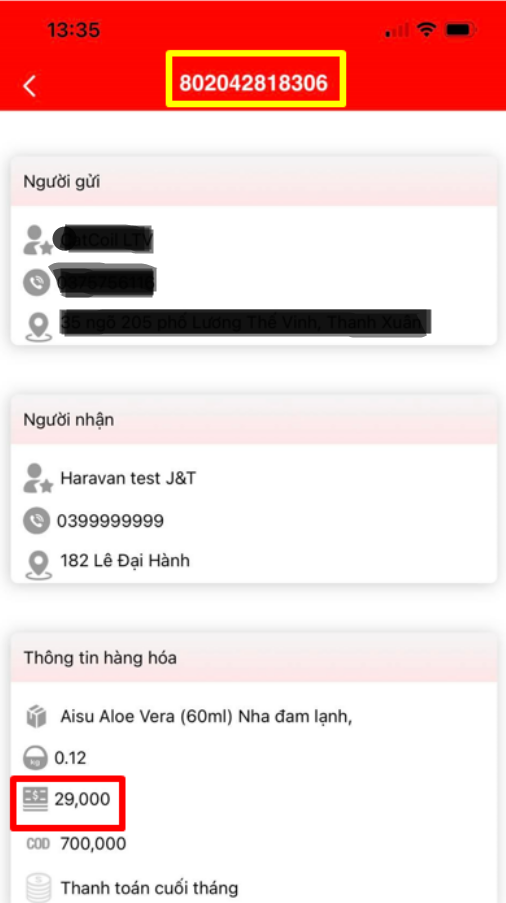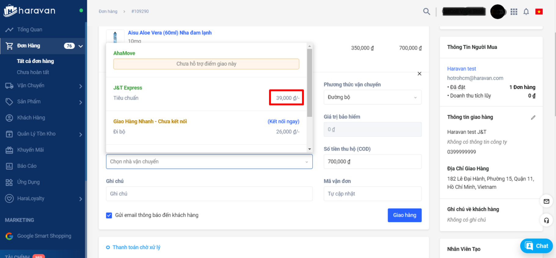 Đơn hàng bị lệch phí vận chuyển giữa Haravan và app J&T, khi khách hàng xử lý đơn hàng tại admin của Haravan → chọn nhà vận chuyển J&T thì phí vận chuyển tại Haravan là 39k nhưng nếu khách hàng vào app J&T để tạo đơn cùng địa chỉ giao (hoặc xem trên app) phí vận chuyển là 29k, Haravan bị lệch 10k so với J&T.