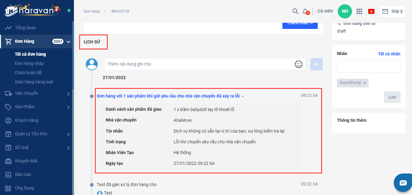 Để kiểm tra lỗi giao hàng, nhà bán hàng xem tại mục Lịch sử trong phần chi tiết đơn hàng