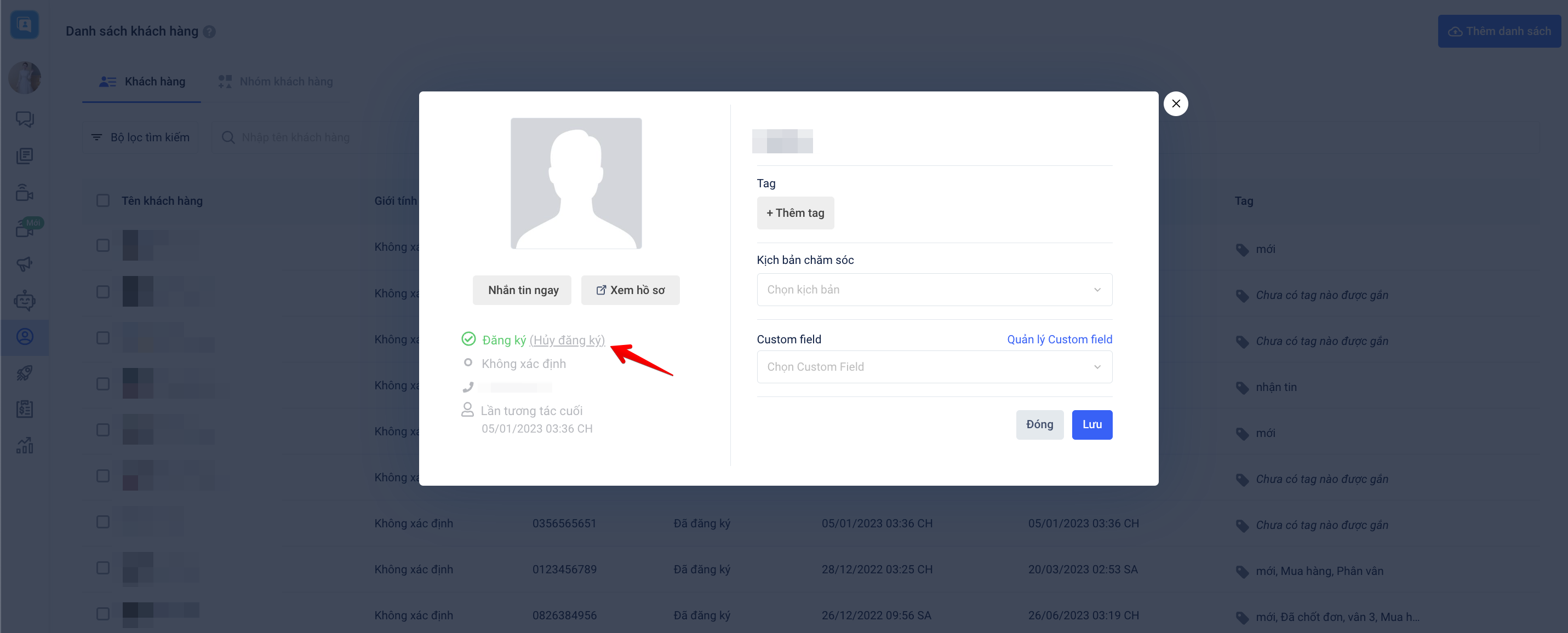 - Nhấn "Hủy đăng ký" chatbot tại mục thông tin khách hàng: