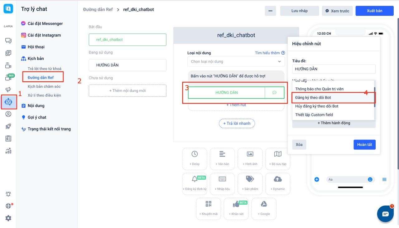 **Cách khắc phục:**Để có thể khôi phục lại công cụ cho phép đăng ký kịch bản chatbot, bạn có thể tạo kịch bản đường dẫn ref có gắn nút kèm hành động "Đăng ký theo dõi Bot" sau đó gắn đường dẫn hoặc gửi đến các tệp khách hàng bị hủy đăng ký bot.