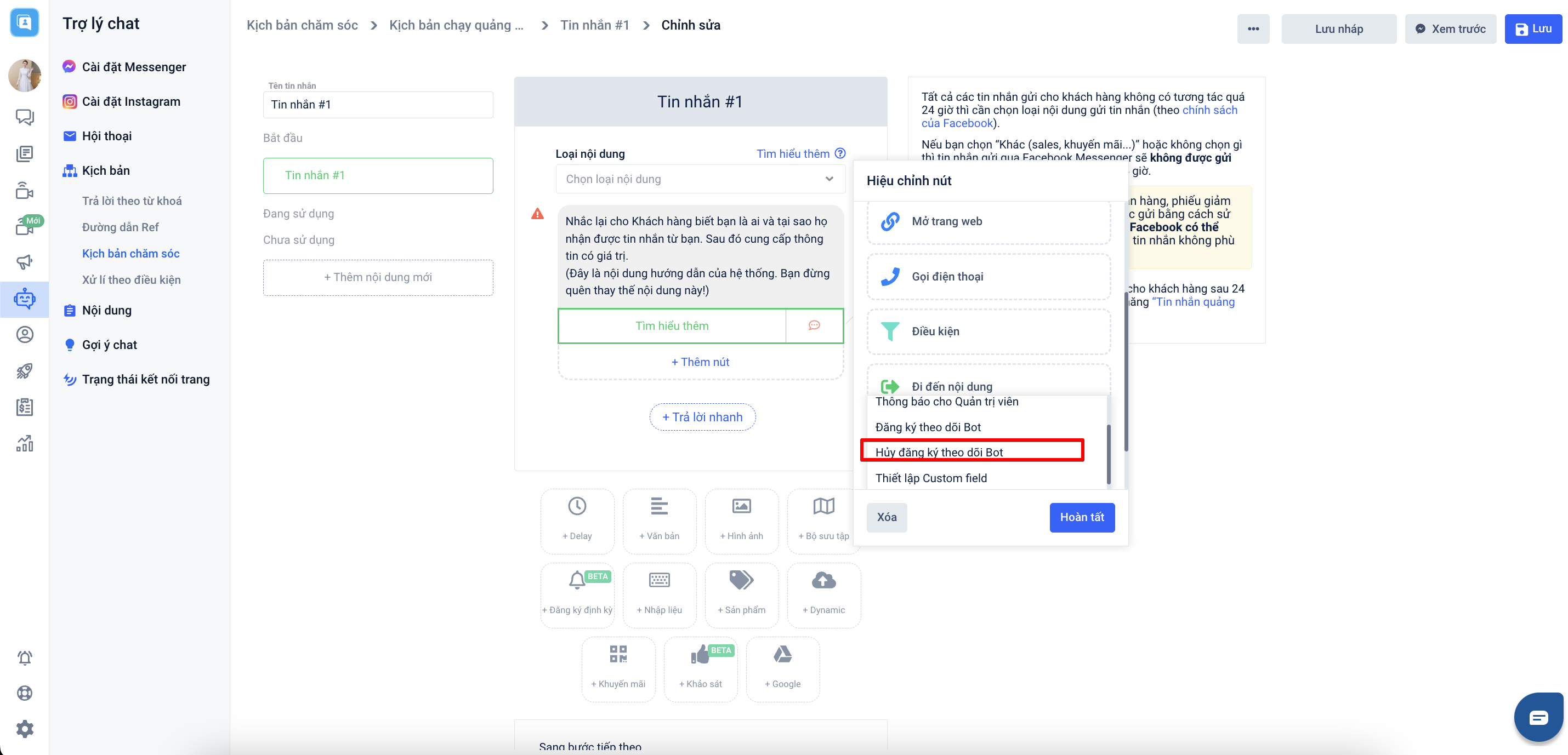 - Gắn kịch bản trước đó cho khách hàng có gắn nút đính kèm hành động "Hủy đăng ký theo dõi Bot":