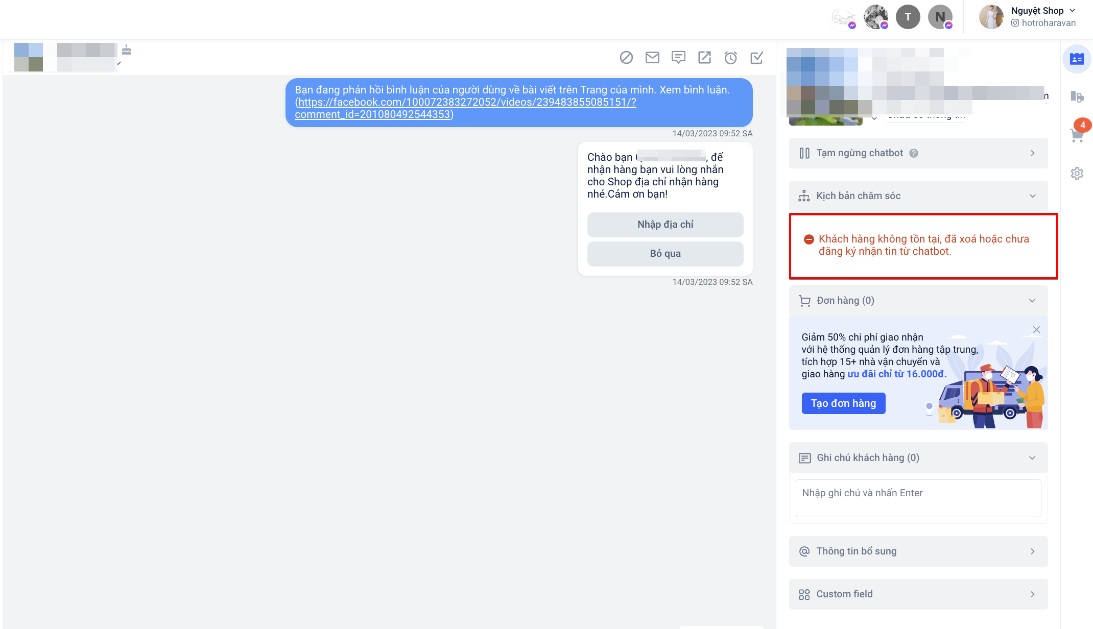 Thực hiện gắn kịch bản cho khách hàng nhưng hệ thống báo lỗi "Khách hàng không tồn tại, đã xóa hoặc chưa đăng ký nhận chatbot"