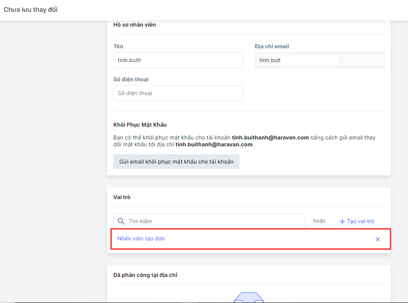 - Sau khi hoàn tất tạo nhóm vai trò, bạn quay lại trang chi tiết tài khoản nhân viên và thêm nhóm vai trò vừa tạo -> chọn Lưu để hoàn tất.