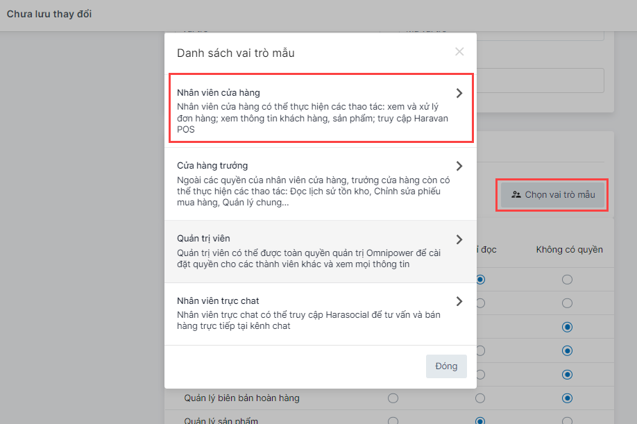 Cách đơn giản nhất để phân quyền về đơn hàng cho tài khoản nhân viên là chọn vai trò Nhân viên cửa hàng trong mục vai trò mẫu. Với vai trò mẫu này, nhân viên có thể tạo đơn hàng, xem đơn hàng tại cửa hàng được phân công nhưng không được phép xuất dữ liệu đơn hàng.