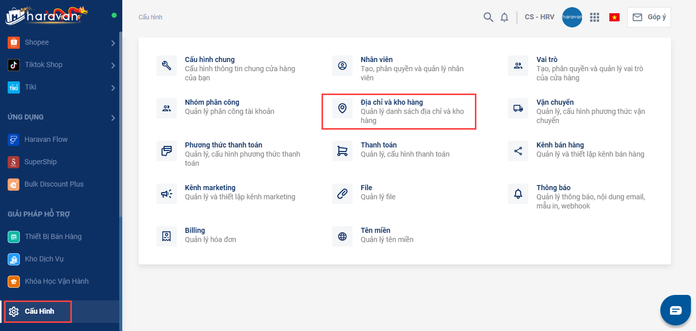 - Tại mục Cấu hình, chọn Địa chỉ và kho hàng