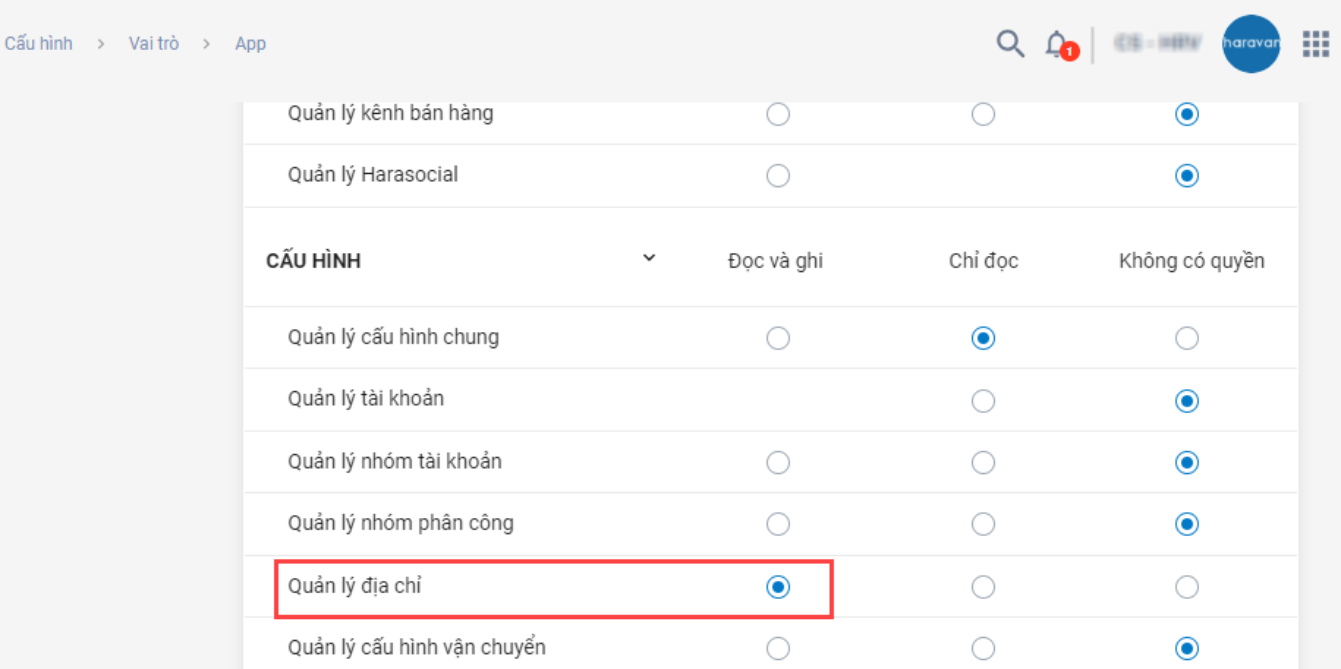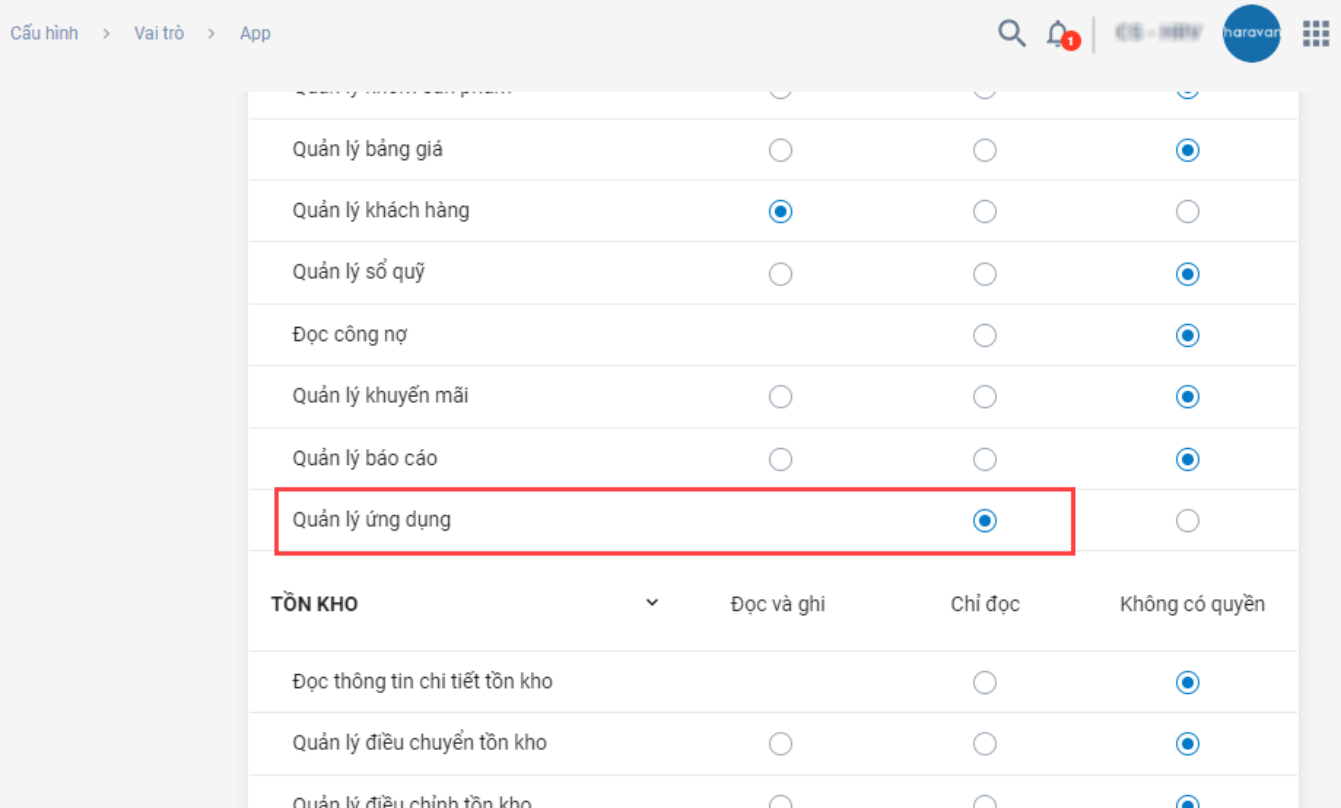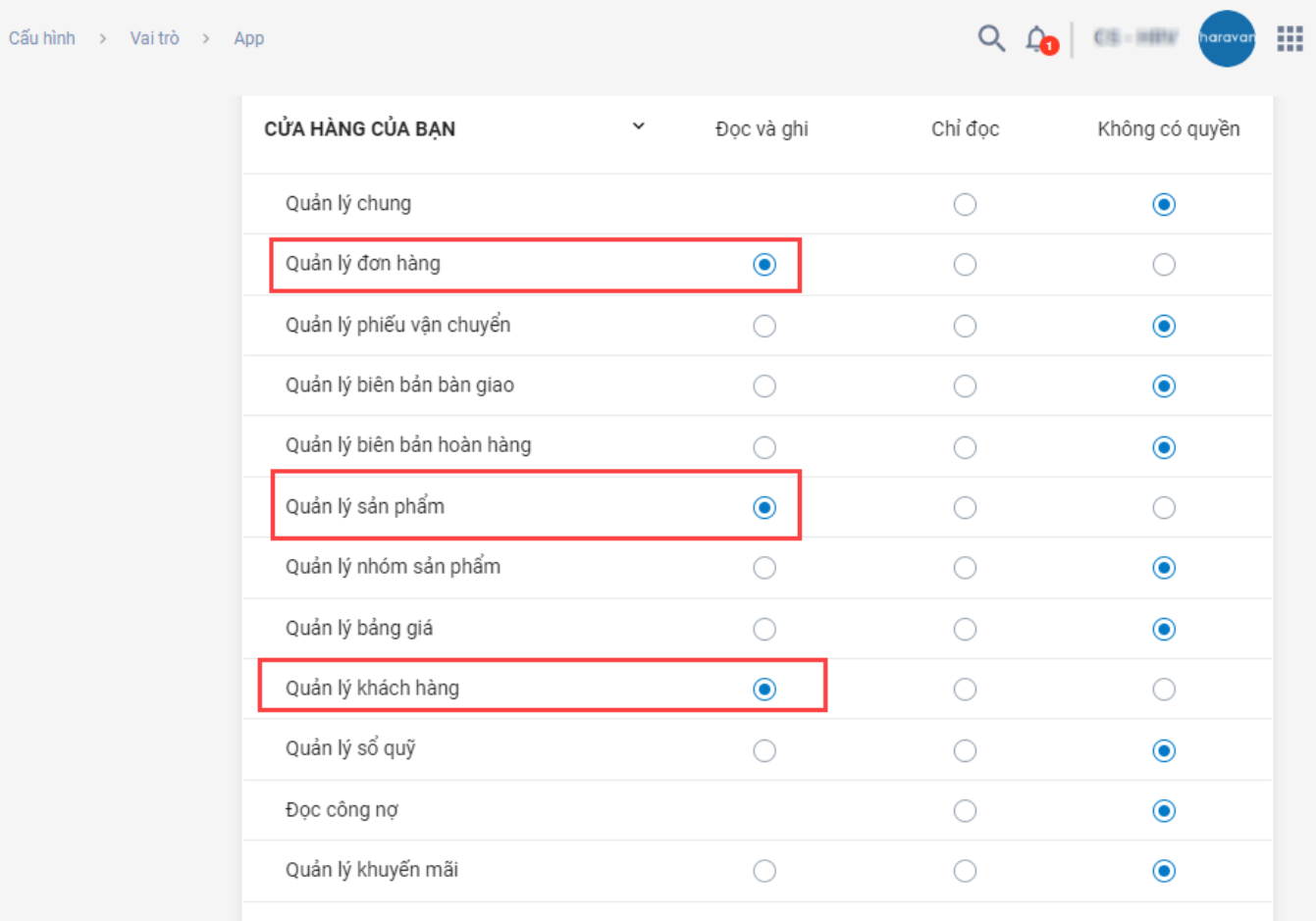 Một tài khoản đăng nhập vào ứng dụng Haravan Mobile App cần có các quyền sau: