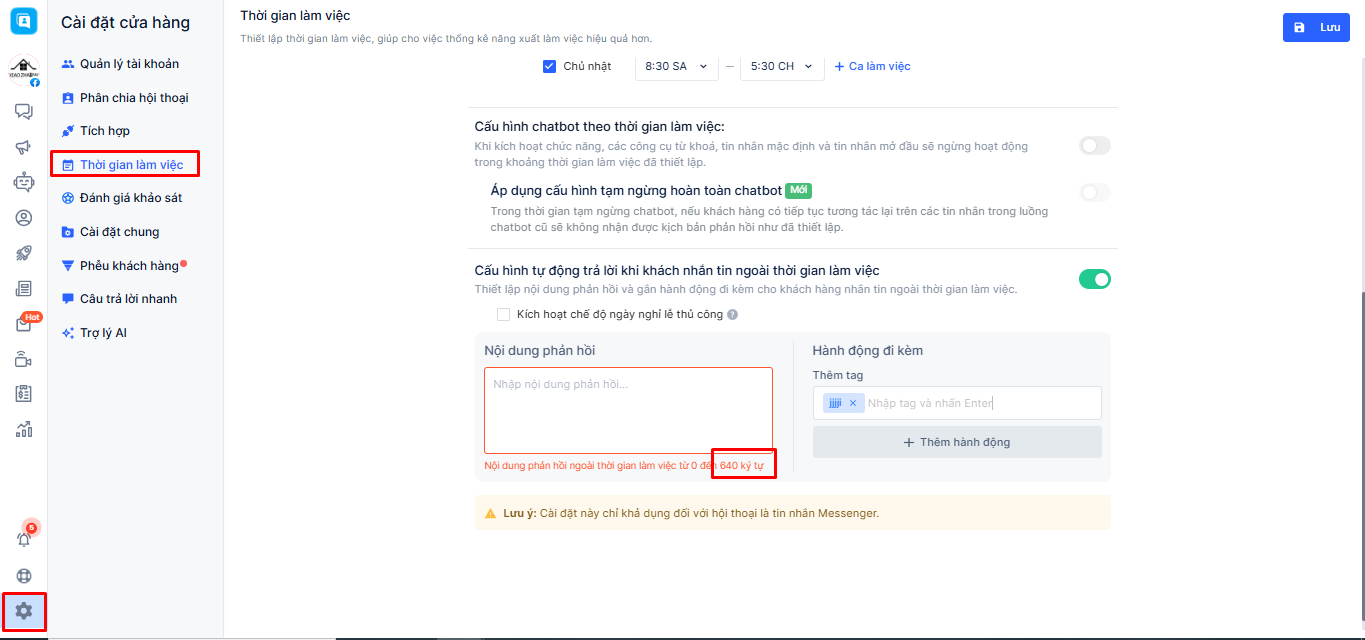 Cấu hình nội dung phản hồi tự động trả lời khi khách nhắn tin ngoài thời gian làm việc hỗ trợ bao nhiêu ký tự tối đa?