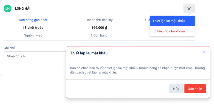 - Chọn thao tác Thiết lập lại mật khẩu và xác nhận gửi email cho khách.